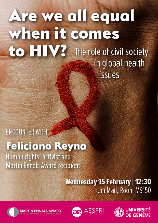 The University of Geneva will welcome, on Wednesday February 15 at 12:30 at Uni Mail, a discussion between students of AESPRI, the Venezuelan human rights activist and recipient of the 2023 Martin Ennals Award, Feliciano Reyna, and Prof. Alexandra Calmy, Head of the HIV Unit in the Department of Infectious Diseases (HUG) and Vice-Dean in charge of humanitarian and international medicine (UNIGE).