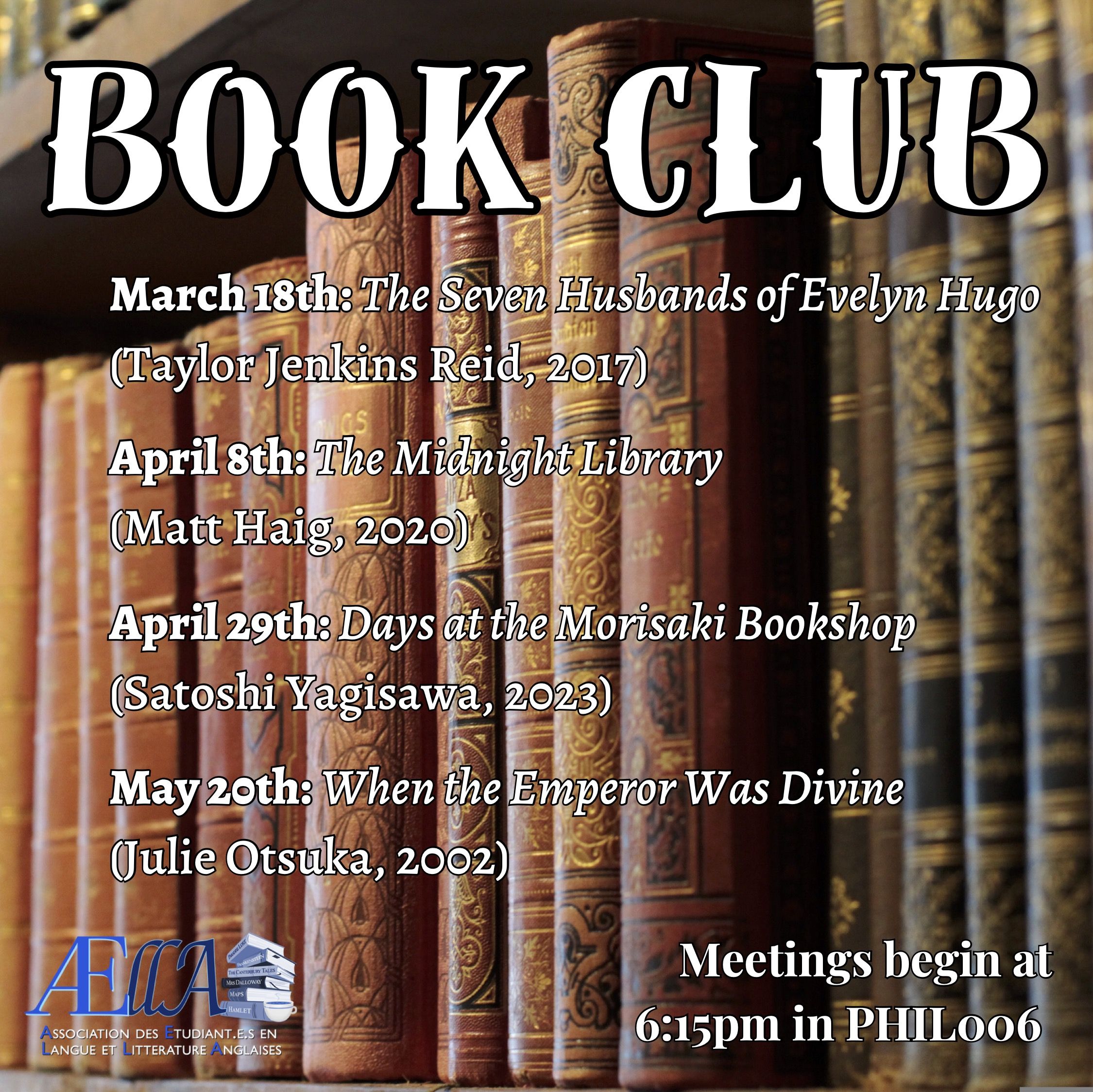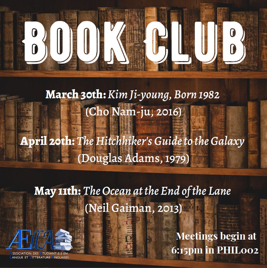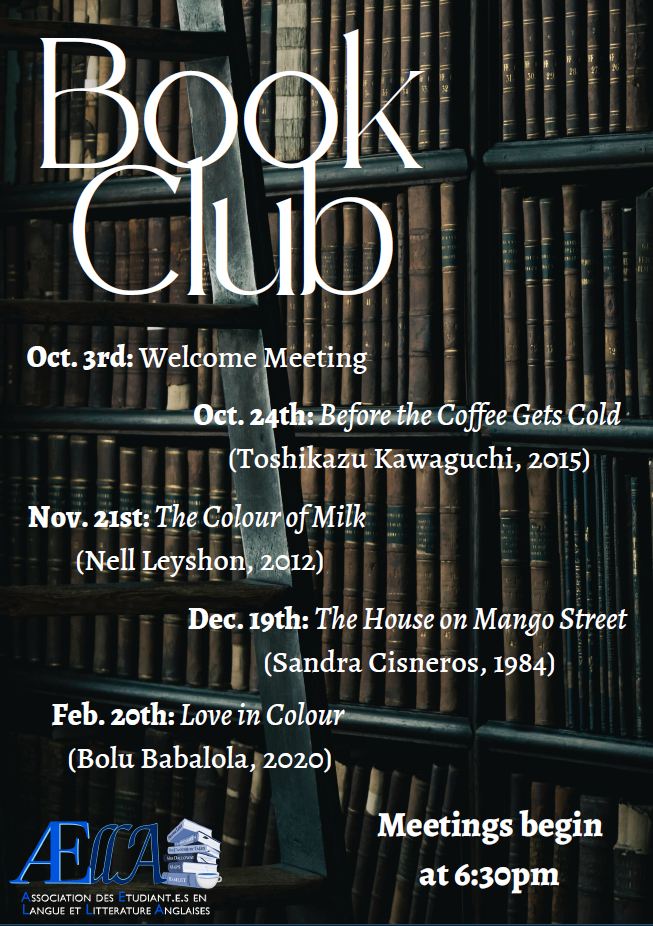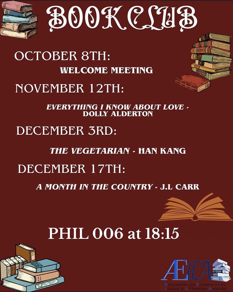 The AELLA Book Club’s goal is to create a fun and welcoming environment in which students from the English department can read books outside of class and discuss them as a group. We meet one evening per month to drink some tea and talk about our chosen book of the month. The Book Club was launched by AELLA members in Spring 2020 and later revived by the AELLA in Spring 2022. Each semester, we choose new books about a variety of subjects; we hope to widen our perspectives by discussing books from different contexts. If you love reading but never find the time to read books outside of class, the AELLA Book Club is perfect for you! Further details can be found on the AELLA's Facebook and Instagram accounts.