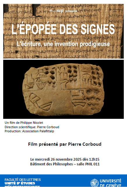 12h15-13h15 : Diffusion et présentation par P. Corboud du film L'Epopée des signes. L'écriture, une invention prodigieuse.