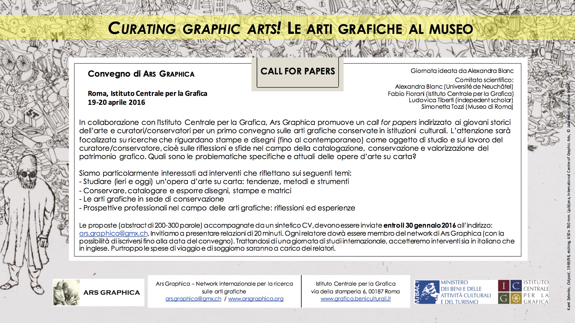In collaboration with the Istituto Centrale per la Grafica, Ars Graphica is organising a symposium for young scholars and curators/conservators dedicated to the graphic arts held in cultural institutions. Curating graphic arts! Le arti grafiche al museo will focus on research related to prints and drawings (from the 15th century to the present) as objects of study and on the curatorial/conservative duties. We want to reflect on the various challenges in the field of cataloguing, curating and exhibiting graphic heritage. Which are the current and specific issues of works of art on paper.