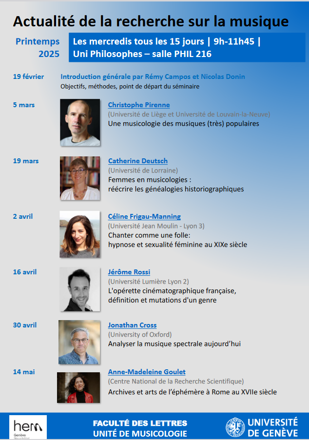 Quels sont actuellement les objets, les méthodes, les questionnements de la recherche sur la musique ? Ce séminaire, organisé par l’Université de Genève et la Haute école de musique de Genève, offre à la possibilité d’aller à la rencontre de celles et ceux qui font la recherche, en musicologie et dans d’autres disciplines associées.