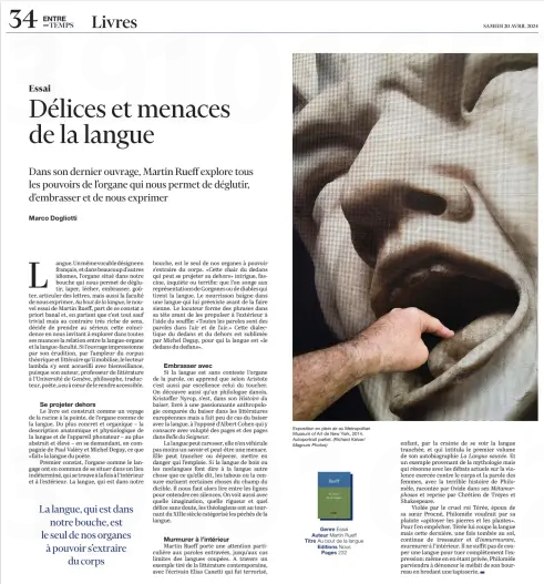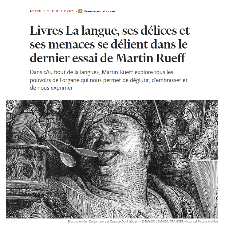 La langue, ses délices et ses menaces se délient dans le dernier essai de Martin rueffLe Temps, 20.04.2024 "Un même vocable désigne en français, et dans beaucoup d’autres idiomes, l’organe situé dans notre bouche qui nous permet de déglutir, laper, lécher, embrasser, goûter, articuler des lettres, mais aussi la faculté de nous exprimer. Au bout de la langue, le nouvel essai de Martin Rueff, part de ce constat a priori banal et, en pariant que c’est tout sauf trivial mais au contraire très riche de sens, décide de prendre au sérieux cette coïncidence en nous invitant à explorer dans toutes ses nuances la relation entre la langue-organe et la langue-faculté." Une présentation de Au bout de la langue (Editions Nous, 2024), dernier essai de Martin Rueff, professeur de littérature française à la Faculté des lettres, philosophe, poète, critique et traducteur.