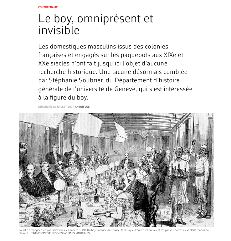 Le Journal de l’UNIGE, n° 129, 21.03.2024 Entretien avec Stéphanie Soubrier, maître-assistante au Département d’histoire générale, sur un sujet longtemps occulté par la recherche, auquel elle vient de consacrer un article : les domestiques masculins issus des colonies françaises et engagés sur les paquebots aux XIXe et XXe siècles. https://www.unige.ch/lejournal/recherche/printemps-2024/boy/ |