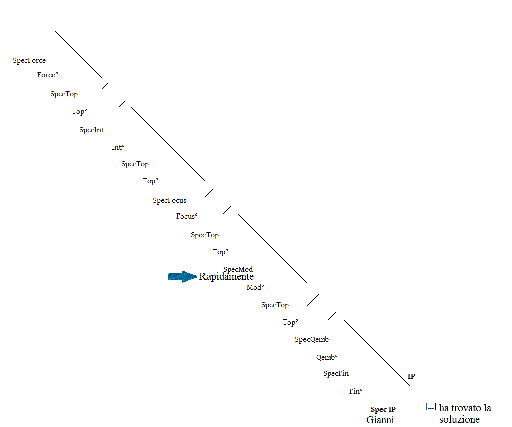 ♦ In the left peripheral map, ModifierP (ModP) is located in the lower part of the CP: it can be higher than the lowest Topic position, but lower than IntP and Focus (when an adverb is higher than Focus, it targets a a high Topic position in the structure):