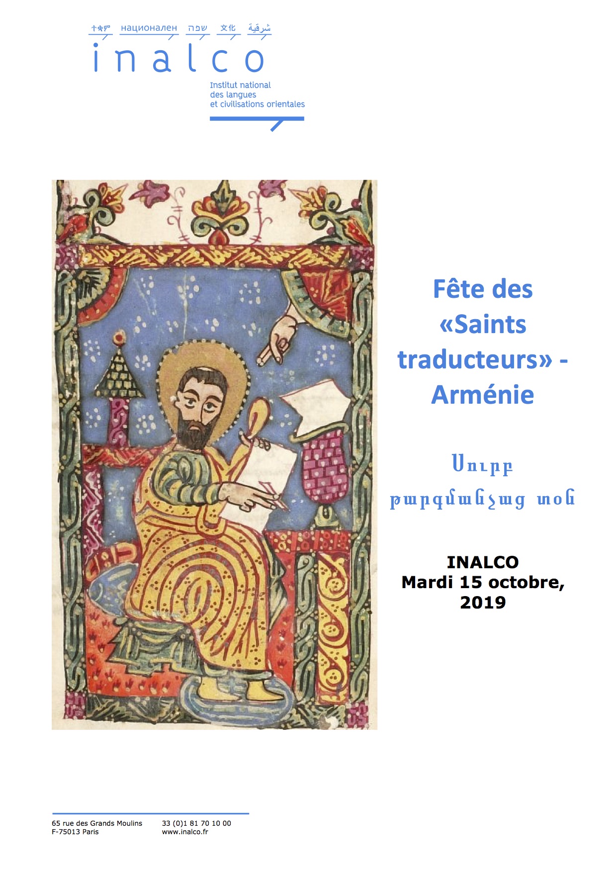La section d'arménien de l'Inalco inaugure un nouveau rendez-vous annuel lié à la fête des Saints Traducteurs : une journée culturelle avec des conférences et tables rondes dans l'auditorium en matinée, confiées à un invité, cette année Valentina Calzolari, suivi d'animations culturelles et gastronomiques dans la hall du deuxième étage de l'Inalco.