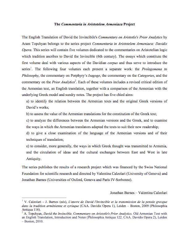 David the Invincible, Commentary on Aristotle's Prior Analytics Old Armenian Text with an English Translation, Introduction and Notes: Aram Topchyan