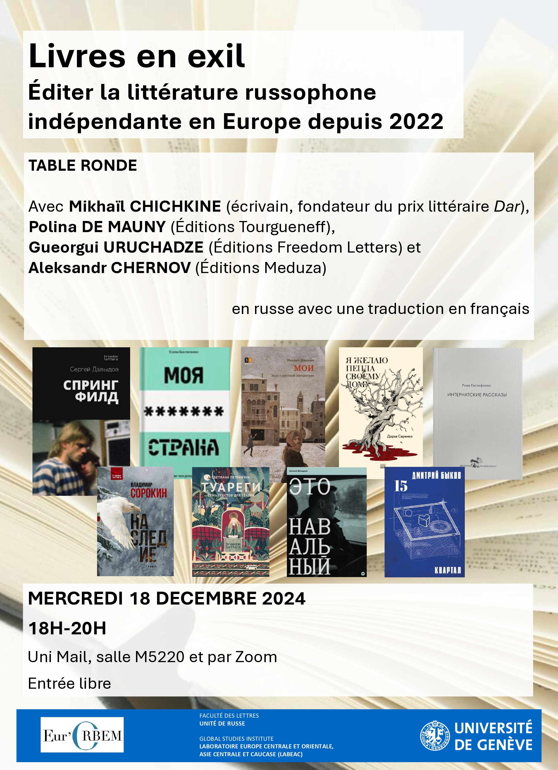 Avec Mikhaïl Chichkine, écrivain et fondateur du prix suisse « Dar », récompensant des œuvres en langue russe ; Polina de Mauny, fondatrice de la maison d’édition russophone Tourgueneff à Paris ; Gueorgui Uruchadze, fondateur des éditions Freedom Letters (en visioconférence), et Agata Semenova, éditrice aux éditions Meduza (en visioconférence).