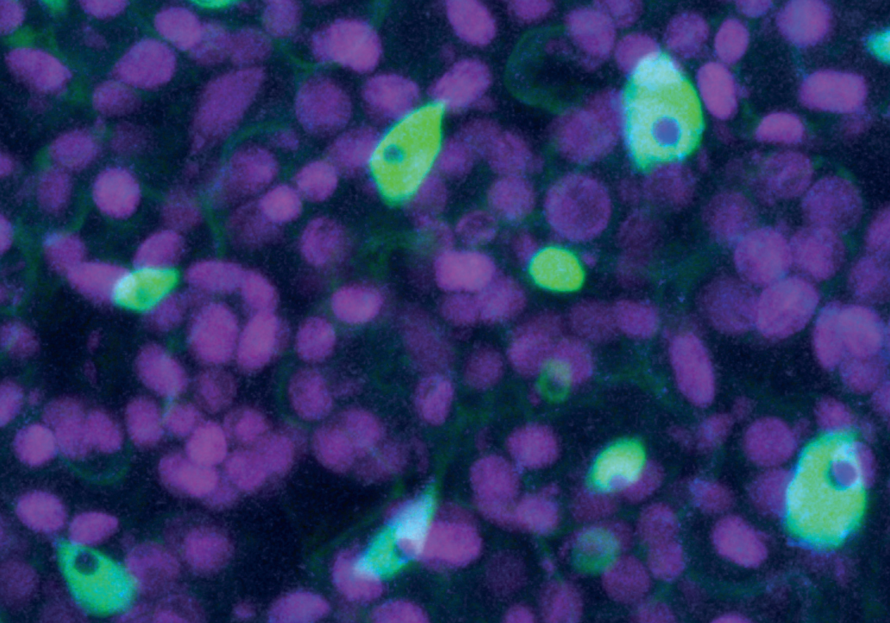 L’image montre l’accumulation de UVR8, révélé par microscopie à fluorescence, dans le noyau des cellules végétales exposées aux UV-B.