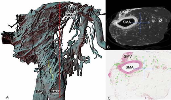 Les lésions intrinsèques et extrinsèques de l'innervation intestinale ont été liées à la « diarrhée postopératoire intraitable ». Une récente augmentation de l'intérêt des chirurgiens viscéraux pour la fonction intestinale postopératoire après résection pour cancer a été observée comme une excision mésocolique complète, avec mésentérectomie étendue, sont au centre des intérêts. Outre les études sur des patients dotés d'une capsule de motilité sans fil (« Smartpill »), l'étude des nerfs comprend des méthodes anatomiques de reconstruction des plexus mésentériques, au moyen de la dissection anatomique, de l'histologie 3D, de la numérisation nanoCT et de l'impression 3D.