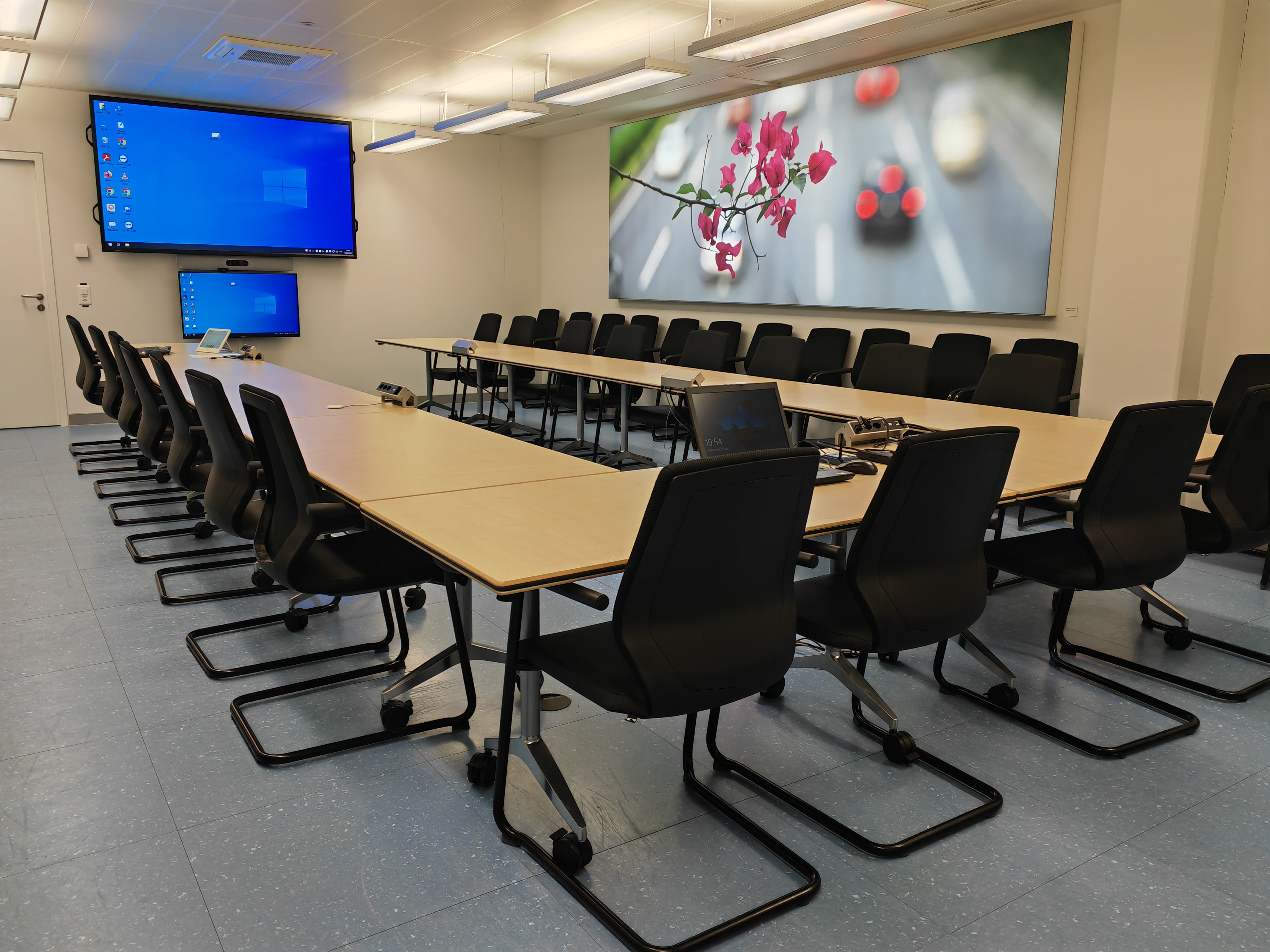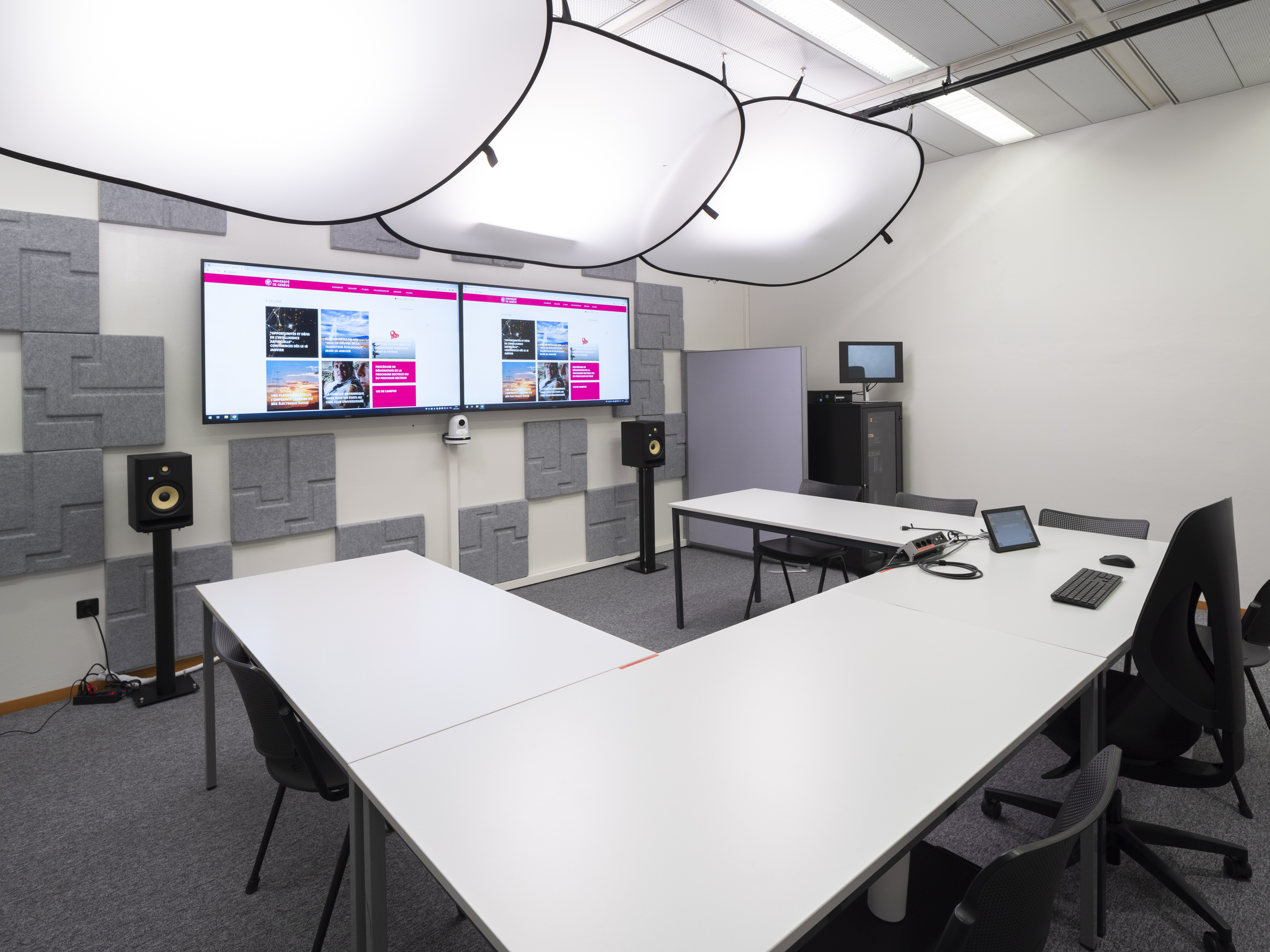 - Visioconférence "mode avancé", permet de connecter à divers systèmes SIP et H323 (Zoom/Teams) et également avec laptops. Écran LCD secondaire (pour afficher les participants externes)