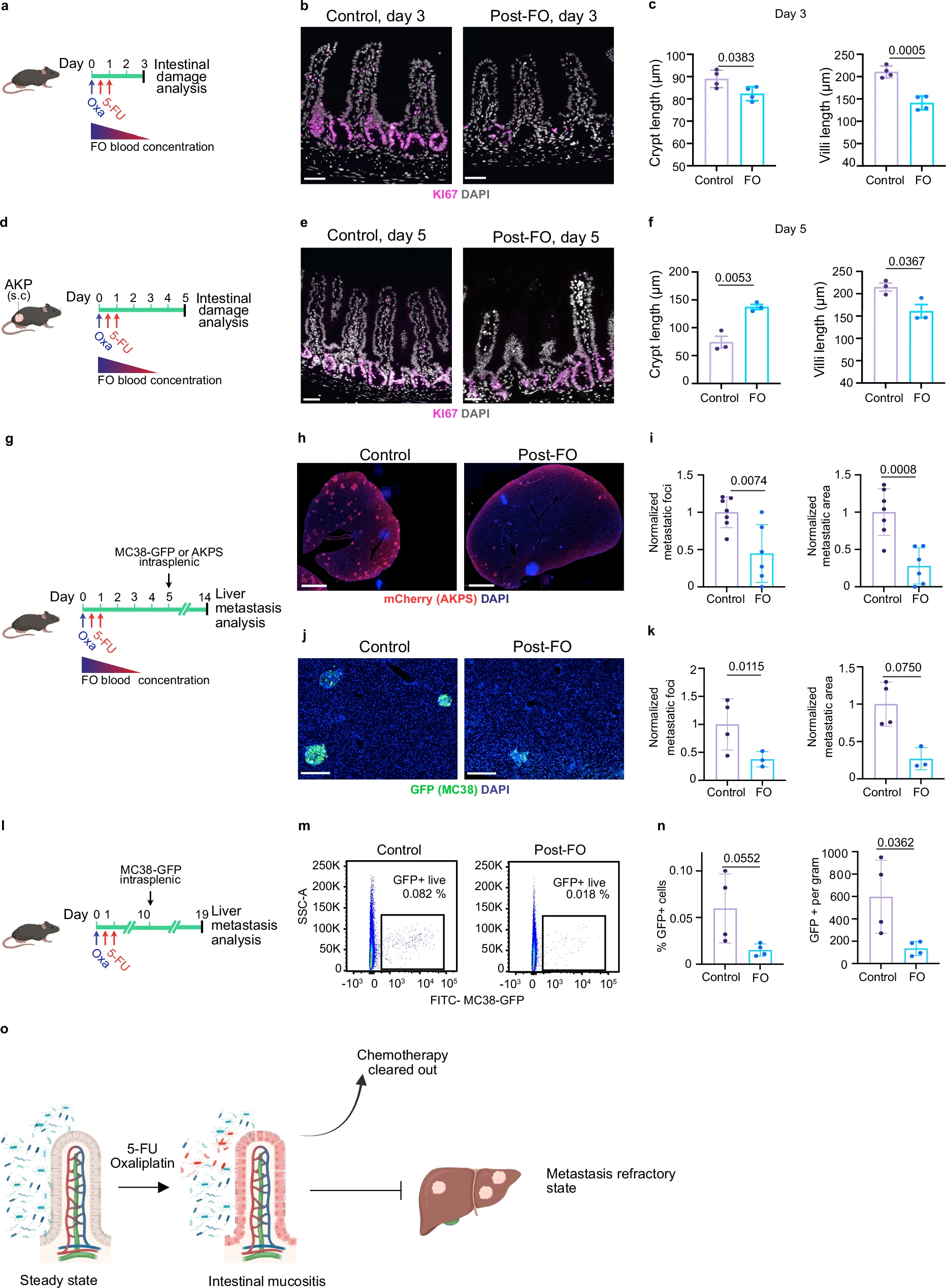 a Scheme of the experiment. Wild-type mice received 5-FU+oxaliplatin (FO) or PBS (control); intestines were harvested 3 days later. b FO reduced proliferation of intestinal crypt cells. KI67 (magenta) and DAPI (grey). Scale bars: 100 μm. c Quantification of crypt (left) and villi (right) length 3 days post-FO. n = 4 per condition. d Scheme of the experiment. AKP organoids were injected subcutaneously and FO treatment was initiated when tumor reached 130 mm3. Tissues were harvested 5 days after FO. e Hyperproliferative crypt cells five days after FO. KI67 (magenta) and DAPI (grey). Scale bars: 100 μm. f Quantification of crypt (left) and villi (right) length five days post-FO. n = 3 per condition. g Scheme of the experiment. AKPS-mCherry or MC38-GFP cells were injected intrasplenically 5 days after FO preconditioning, when active form of FO has been cleared-out. h FO preconditioning reduces liver metastasis formation in AKPS model. Staining for tumor cells (mCherry, red) and DNA (blue). Scale bar: 2 mm. i Quantification of AKPS metastasis area and number per liver area normalized to control mean. Data are from two independent experiments. Control, n = 7. FO, n = 6. j FO preconditioning reduces liver metastasis formation in MC38-GFP model. Staining for GFP (green) and DNA (blue). Scale bar: 200 μm. k Quantification of MC38-GFP metastasis area and number per liver area normalized to control mean. Control, n = 4. FO, n = 3. l Scheme of the experiment. MC38-GFP cells were injected intrasplenically 10 days after FO preconditioning. m FO chemomemory is lasting. Representative FACS plots of GFP+ cancer cells in livers of control and FO pre-conditioned mice. n Quantification of percentage and count of GFP positive cancer cells in the indicated conditions. n = 4 per condition. o Chemotherapy exposure exerts a lasting antimetastatic effect on CRC liver metastasis. Data are shown as mean ± SD and analyzed using two-tailed unpaired Student’s t- test (c, f, i, k, n).