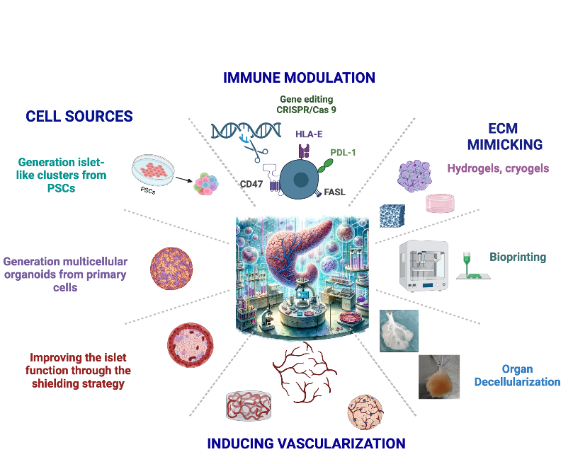 To overcome these obstacles, we are exploring innovative bioengineering strategies, including the development of alternative sources of endocrine cells and the creation of technologies that mimic the natural environment of islets.