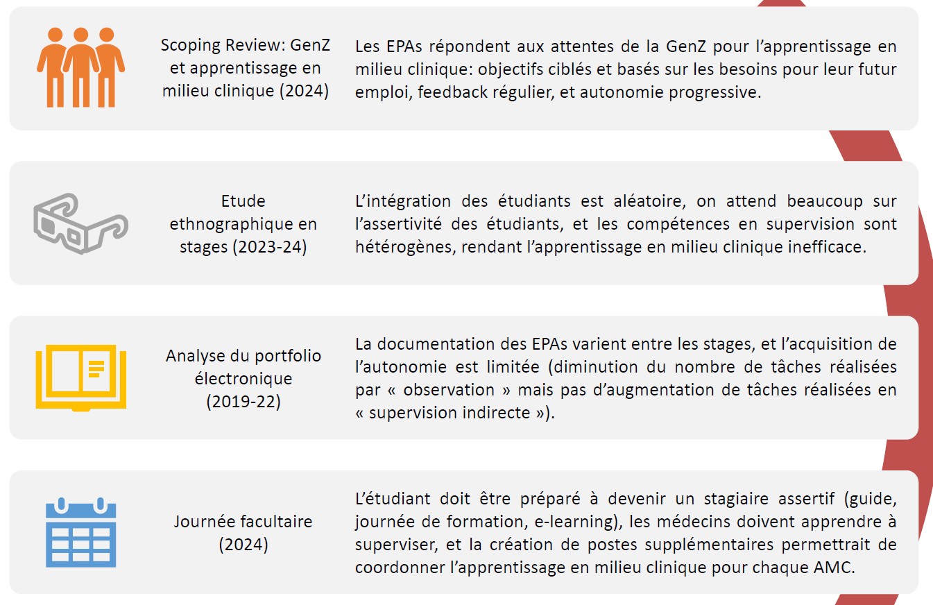 L’immersion en milieu clinique est une part importante de l’apprentissage des compétences des étudiant-es de médecine. Depuis la réforme basée sur les compétences, les stagiaires réalisent et documentent des Entrustable Professional Activities (EPA) des tâches cliniques telles que l’anamnèse, la proposition d’examens complémentaires, la génération de diagnostic différentiel, la documentation, etc. Grâce à la supervision et aux feedbacks, les étudiant-es devraient acquérir progressivement l’autonomie nécessaire pour réaliser ces tâches de manière autonome dès leur premier jour d’internat.