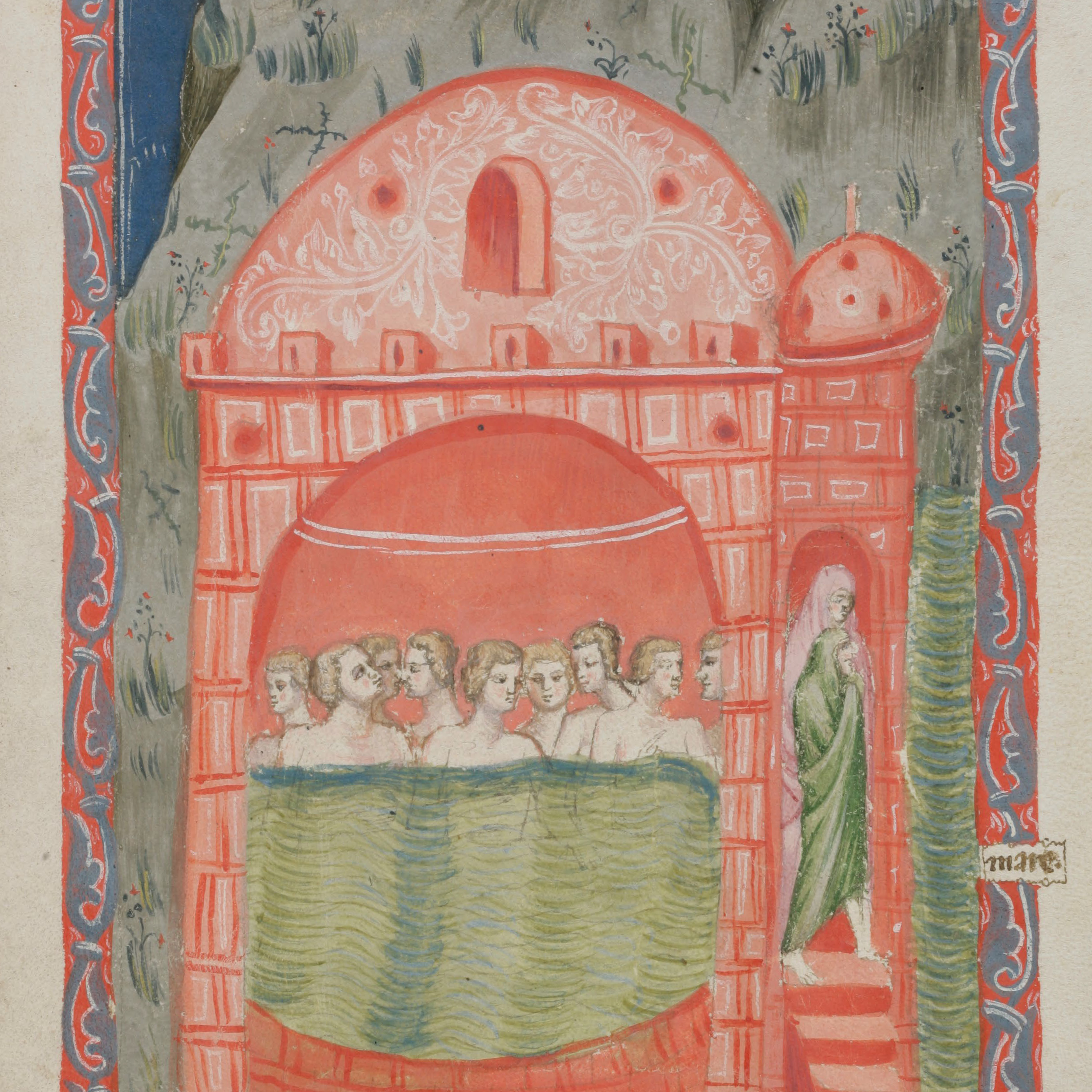 Les noms et les vertus des Bains de Pouzzoles et de Baïes est un guide illustré en vers consacré aux thermes des Champs Phlégréens, zone volcanique au nord-ouest de Naples, dont les eaux riches en minéraux étaient depuis longtemps utilisées à des fins thérapeutiques. Rédigé à la fin du XIIe ou au début du XIIIe siècle par le moine-poète de la cour, Pierre d’Eboli, le poème présente une série d’épigrammes élégiaques illustrées qui décrivent les thermes sur la route reliant Agnano, près de Naples, à l’autre versant de la Baie de Pozzuoli (Pouzzoles). Beaucoup de ces établissements étaient une survivance des lieux de plaisirs de l’Antiquité classique; d’autres bains datant du Moyen Âge étaient surtout fréquentés à des fins médicales. Cet ouvrage est la principale source d’informations sur les thermes et leur valeur thérapeutique.