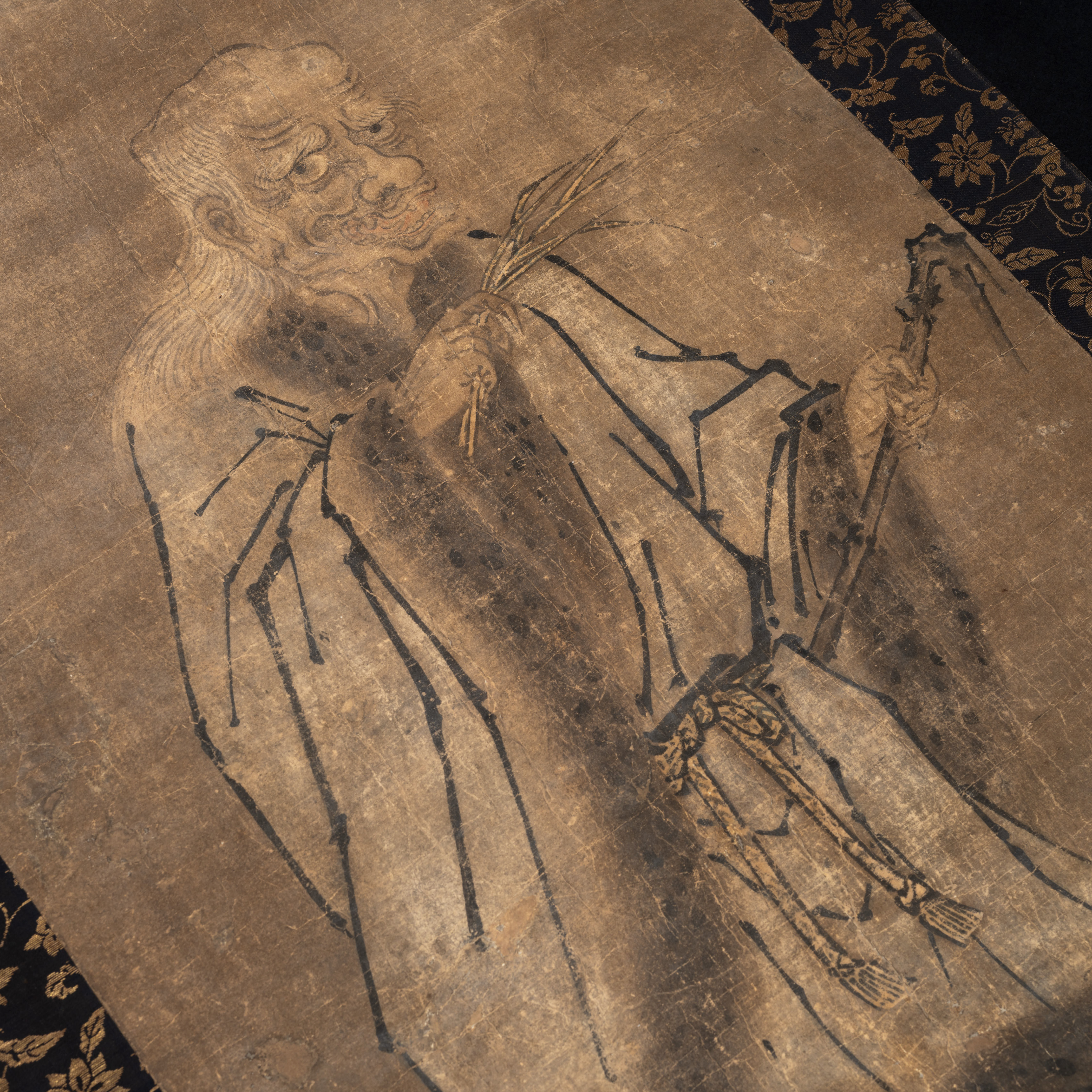 Attribué à Kanô Motonobu (1476-1559), maître de l’école Kano, ce portrait à l’encre représente Shennong, vénéré en Chine comme le père de l’agriculture et de la médecine traditionnelle. En traversant les mers, son mythe s’enracina au Japon, où il devint Shin Nô, divinité protectrice des médecins et des apothicaires. Un sanctuaire Shintô lui est consacré à Dôshò-machi, quartier historique d’Osaka où se concentre l'industrie pharmaceutique japonaise.