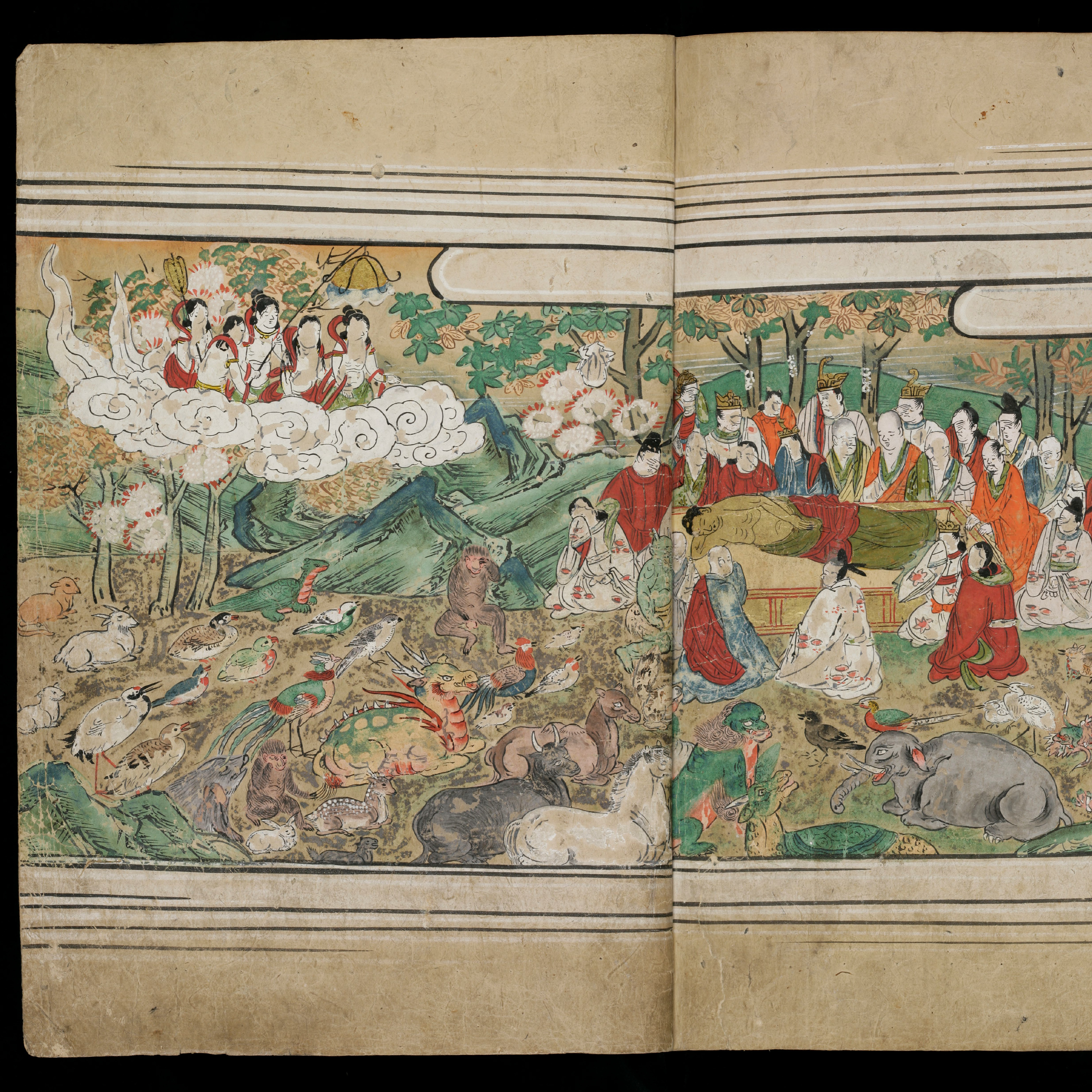 Cette représentation, typique de la mort ou plutôt de l’entrée en paranirvana, du Bouddha historique Sakyamuni est due au pinceau d’un copiste japonais anonyme, probablement de l’époque Momoyama (début XVIe s.) ou Edo (début XVIIe s.). Elle illustre un livre de conte spirituel bouddhique.