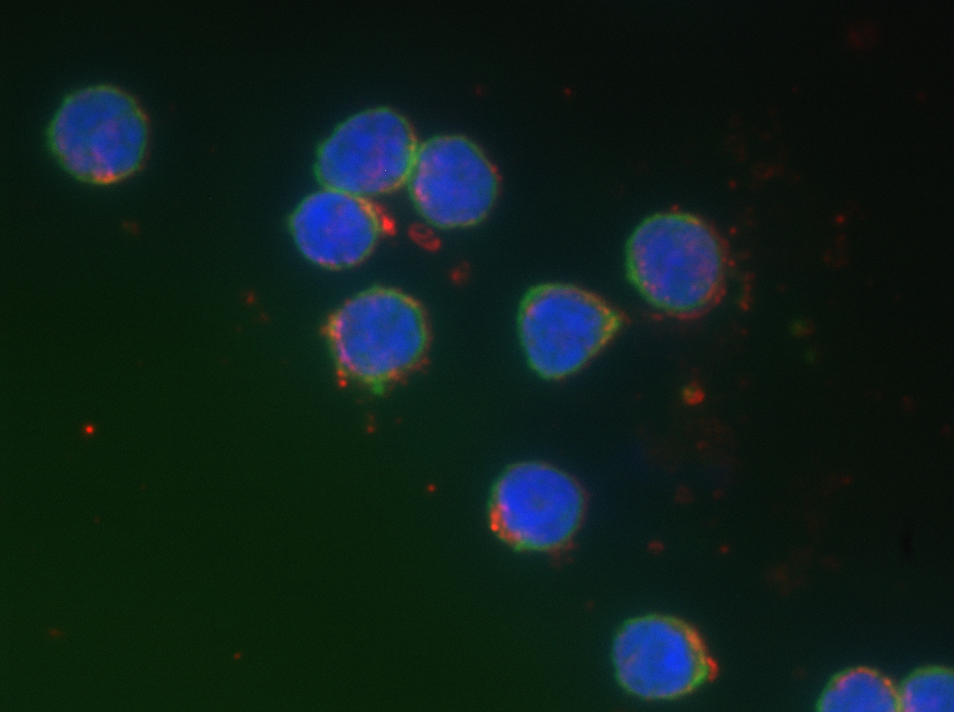 Lymphocytes B (bleu et vert) et nanoparticules d’or (rouge) mesurés par imagerie hyperspectrale en champ sombre couplée à une détection fluorescente. © UNIGE