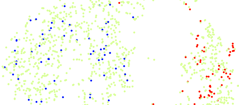 Le séquençage d’ARN avec la technique du Spiked-single-cell attribue des phénotypes à des groupes de cellules. Exemple de cartographie d’un seul groupe de cellules montrant (en vert) la population hétérogène de cellules cancéreuses qui se divise en deux groupes. La cartographie des pointages permet d’identifier les cellules ayant un potentiel métastatique variable par le retour du clone métastatique (en rouge) vers un groupe, et du clone non métastatique (en bleu) vers l’autre groupe. © UNIGE/Ariel Ruiz i Altaba