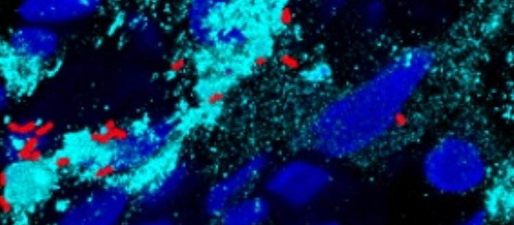 Les bactéries (en rouge) adhèrent aux bornes d’amarrage (en bleu turquoise) formées à la surface des cellules respiratoires atteintes de mucoviscidose (en bleu). © Laboratoire du Prof. Chanson - UNIGE