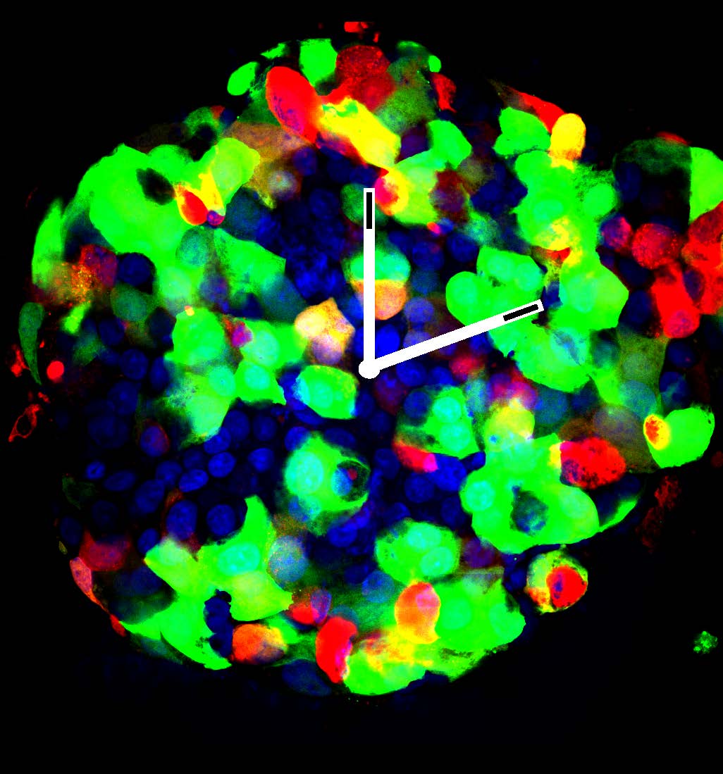 © UNIGE , Dibner Lab. Ilot de Langerhans du pancréas avec en vert les cellules productrices d’insuline, en rouge les cellules productrices de glucagon, et en bleu les noyaux cellulaires.