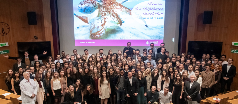 La Faculté de médecine a célébré, le 20 novembre dernier, ses 180 nouveaux diplômés Bachelor, 154 en médecine humaine et 26 en médecine dentaire. Ils ont reçu leur premier diplôme académique des mains du professeur Henri Bounameaux, doyen de la Faculté de médecine, en présence des professeurs Serge Bouillaguet, conseiller aux études en médecine dentaire, Marc Chanson, responsable du programme Bachelor, et Dominique Garcin. Toutes nos félicitations!
