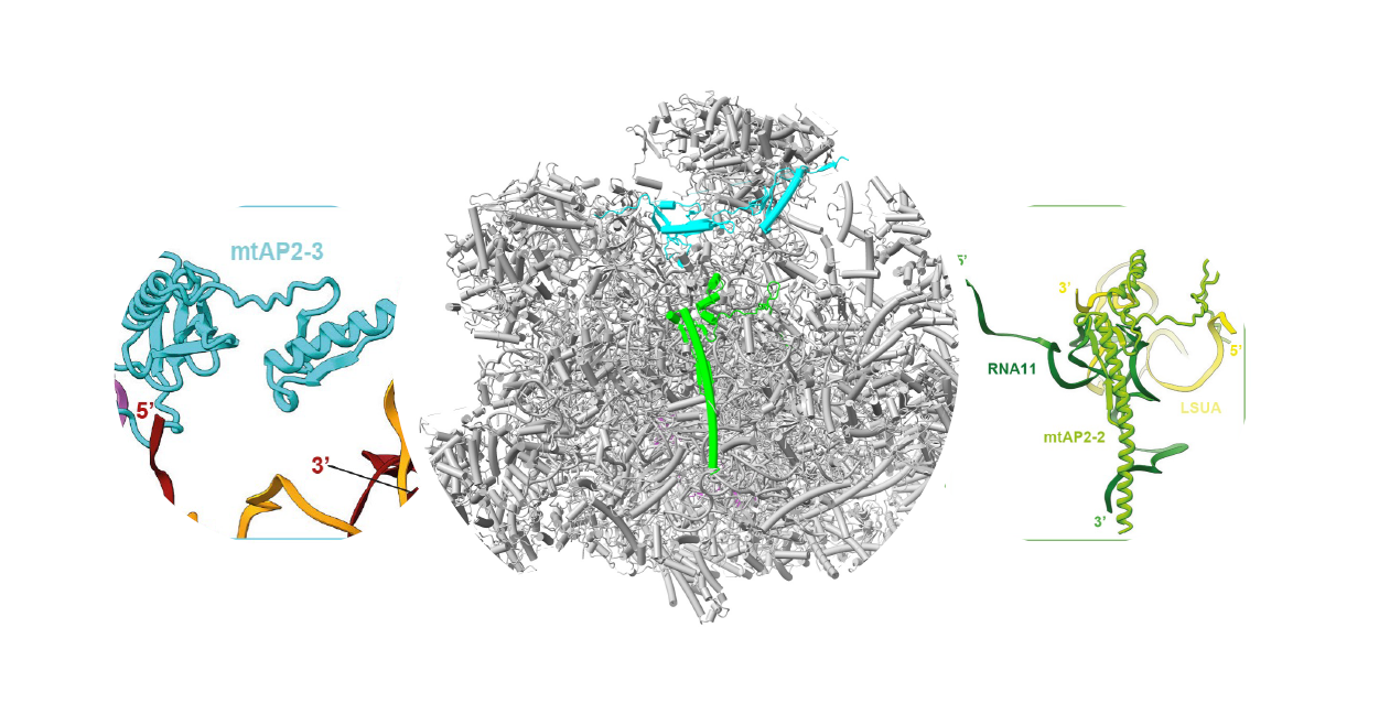 Mitochondria, often referred to as the powerhouses of the cell, rely on specialized molecular machines called mitoribosomes to produce proteins essential for energy generation. In a group of parasites called Apicomplexa, including Plasmodium falciparum, which causes malaria, and Toxoplasma gondii, the agent of toxoplasmosis, these mitoribosomes are exceptionally complex and poorly understood. This research uncovered a surprising discovery: four proteins, traditionally known as transcription factors (ApiAP2s), were found in T. gondii as essential components of its mitoribosome. These mitochondrial AP2s (mtAP2s), instead of binding DNA as expected, take on a completely new role in T. gondii. They assemble highly fragmented pieces of ribosomal RNAs into a functional mitoribosome. Without these proteins, critical components of the mitochondrial energy machinery, Complexes III and IV, fail to form, crippling energy production. Using advanced imaging techniques (CryoEM), the authors revealed that the T. gondii mitoribosome consists of over 120 proteins and more than 40 fragmented RNA pieces, making it far more complex than those found in other organisms. The mtAP2 proteins act as RNA-binding anchors, stitching together fragmented rRNAs to create a functional translation machine to ensure normal mitochondrial function.