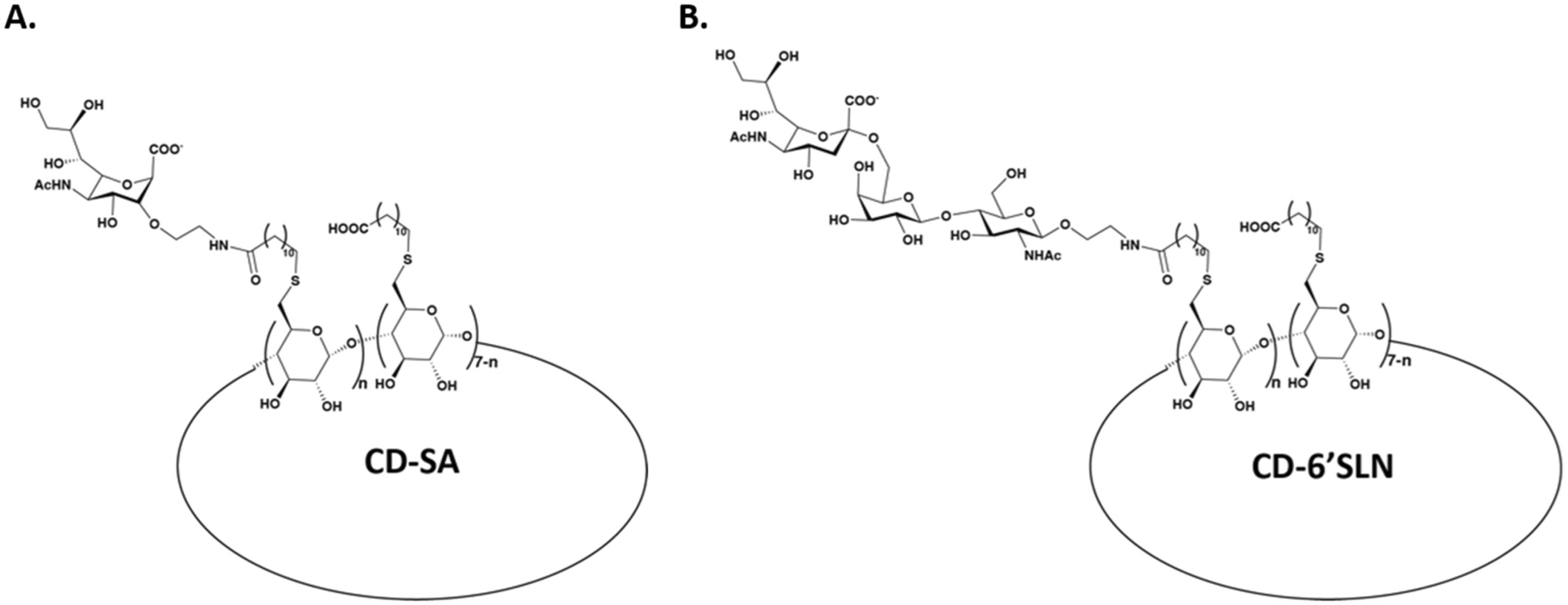 In recent decades, epidemics and pandemics have multiplied throughout the world, with viruses generally being the primary responsible agents. Among these, influenza viruses play a key role, as they potentially cause severe respiratory distress, representing a major threat to public health. This study, led by GCIR Professor Caroline Tapparel, aims to develop new broad-spectrum antivirals against influenza to improve the response to viral disease outbreaks. They engineered macromolecules (named CD-SA) consisting of a β-cyclodextrin scaffold modified with hydrophobic linkers in the primary face, onto which unitary sialic acid epitopes are covalently grafted to mimic influenza virus−host receptors. They assessed the antiviral efficacy, mechanism of action, and the genetic barrier to resistance of this compound against influenza in vitro, ex vivo, and in vivo. The authors demonstrated that CD-SA, with a unitary SA, without extensive polysaccharides or specific connectivity, acts as a potent virucidal antiviral against several human influenza A and B viruses. Additionally, CD-SA displayed antiviral activity against SARS-CoV-2, a virus that also relies on sialic acid for attachment. Then they assessed the genetic barrier to resistance for CD-SA. While resistance emerged after six passages with CD-SA alone, the virus remained sensitive through eight passages when co-treated with interferon-λ1 (IFN λ1). Finally, they completed the characterization of the antiviral activity by conducting both ex vivo and in vivo studies, demonstrating a potent antiviral effect in human airway epithelia and in a mouse model of infection, higher than that of Oseltamivir, a currently approved anti-influenza antiviral. The findings presented in this study support the potential therapeutic utility of a novel β-cyclodextrin-based nanomaterial for the treatment of influenza infections and potentially other sialic acid-dependent viruses.