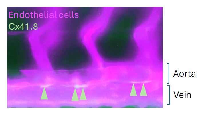 Blood stem cells, which give rise to all types of blood cells, are born from special blood vessel cells in the embryo through a process called endothelial-to-haematopoietic transition (EHT). This study found that a protein called Connexin 41.8 (similar to human CX40) is crucial for the timing of this transformation in zebrafish. Connexin 41.8 helps generate tiny signals from mitochondria, called reactive oxygen species (ROS), which are needed to turn on key genes that start blood stem cell development. Understanding this timing could help scientists improve methods to grow blood stem cells in the lab, potentially revolutionising treatments for blood diseases and supporting regenerative therapies.