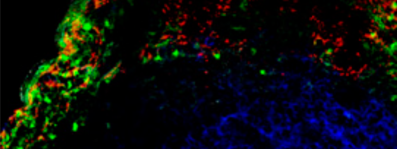 ©UNIGE, Didierlaurent, JI, 2009. Vaccine components (green: adjuvant and red: antigen) entering the lymph node after immunization.