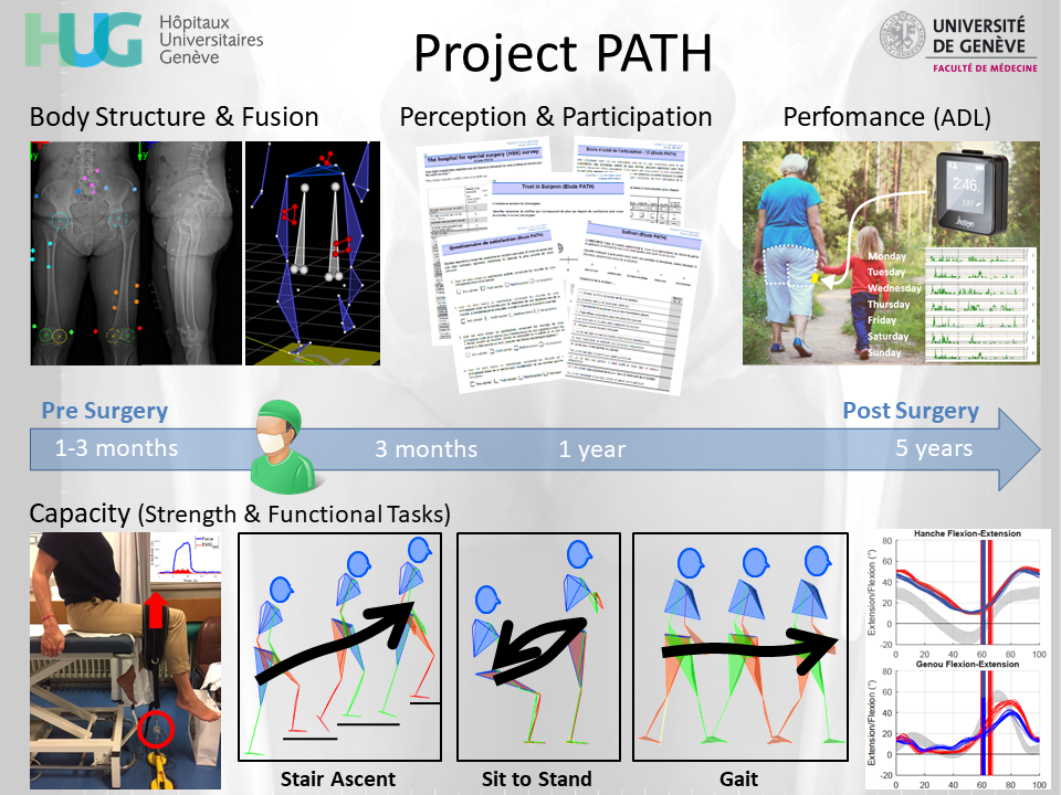 Total hip arthroplasty (THA) is a highly successful, common and cost-effective surgical procedure to alleviate pain and restore function. Per year, more than 1 million patients are operated worldwide but the ageing population, obesity epidemic and increasingly younger target population might double the incidences within the next two decades. Significant advances in implant technology and surgical procedure result in excellent short-term and long-term outcomes. However, while 90% of the patients are satisfied with their surgery, less than 50% of the patients have all their expectations fulfilled after hip replacement (Geneva Joint Arthroplasty Registry, 1996-2015). This issue is largely due to function impairments (as defined by the WHO’s ICF), indeed, the restoration of function after THA has been consistently reported as the most important expectation of patients pre-surgery.