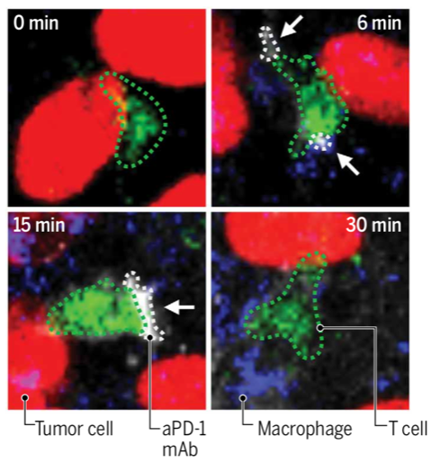 Illustration: Intravital microscopy images showing how drugs used in immunotherapy work in real time (here, anti-PD-1 antibody (aPD-1), a drug used in cancer treatment to bind and activate T cells). The sequence of images takes place inside a tumour and follows a T-cell (in green), surrounded by several tumour cells (in red). The aPD-1 antibody (white) binds to the T-cell quickly, here after 6 minutes, but is "lost" after 30 minutes. New treatments that allow the aPD-1 antibody to bind longer to T cells may be more effective in fighting cancer.