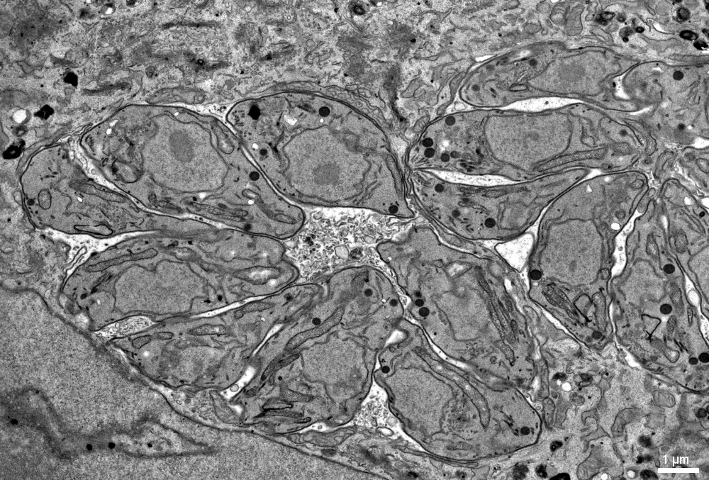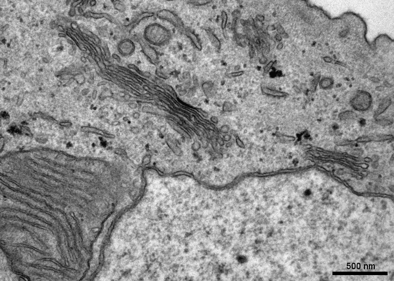 The cellular ultrastructure of biological samples (cells or tissues) imaged with transmission electron microscope (TEM) is accessible through ultrathin-sections (50 - 80 nm) from the specimen embedded in epoxy resin cured block.