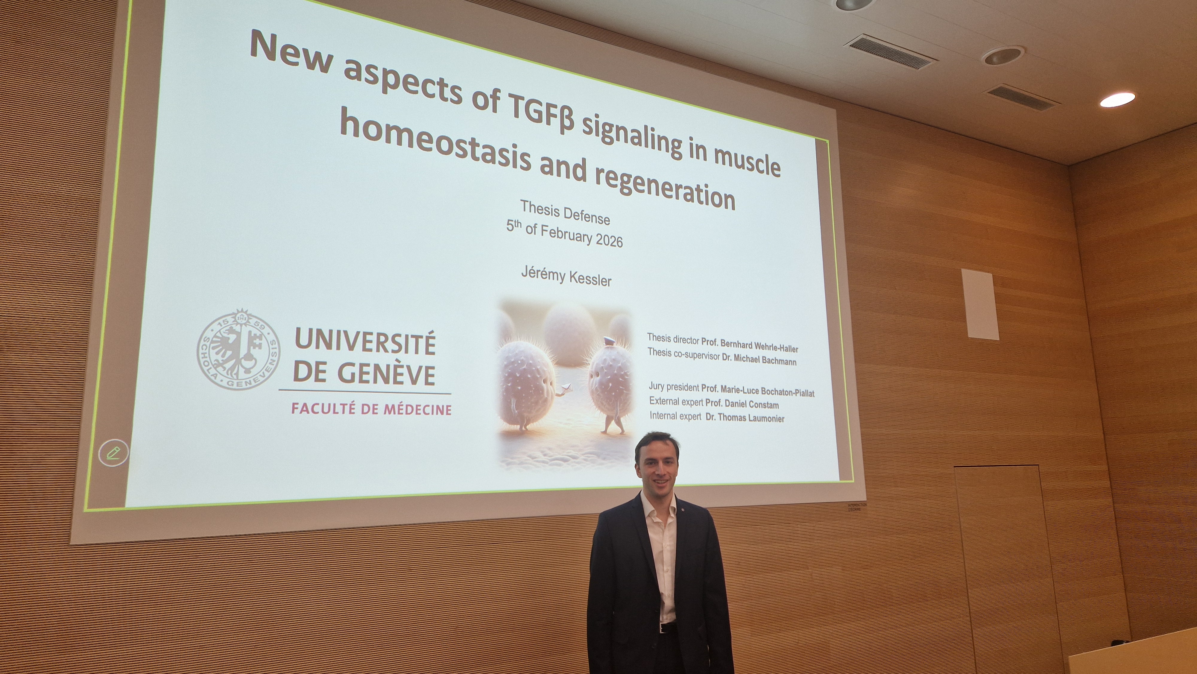 Le 5 février 2026, Mr Jérémy KESSLER a soutenu avec succès sa thèse de doctorat intitulée "New aspects of TGFβ signaling in muscle homeostasis and regeneration". Sa thèse a été menée sous la direction du Pr Bernhard WEHRLE-HALLER du Département de physiologie cellulaire et métabolisme.