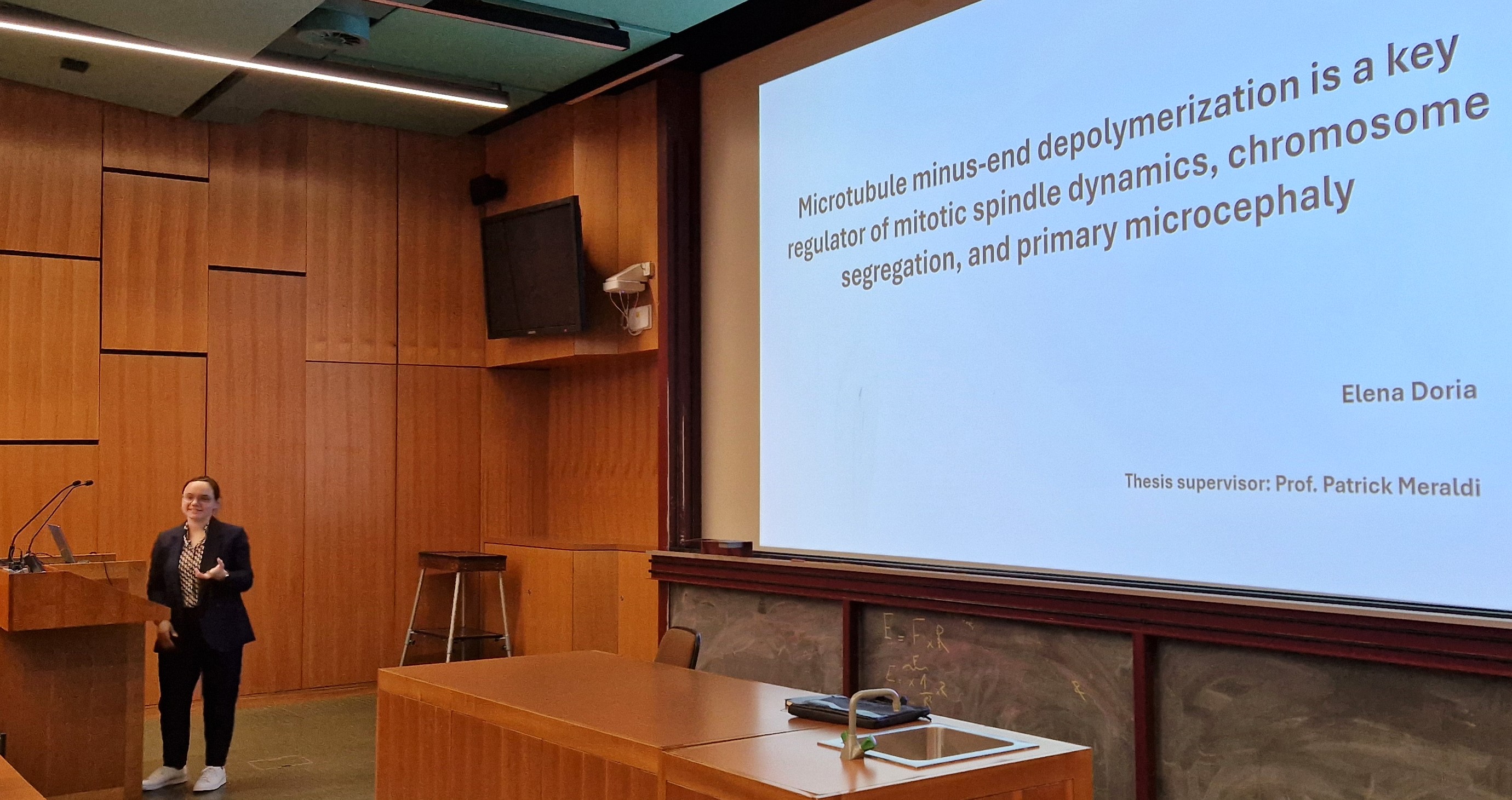 Le 31 octobre 2024, Madame Elena Doria a défendu avec succès sa thèse de doctorat intitulée "Microtubule minus-end depolymerization is a key regulator of mitotic spindle dynamics, chromosome segregation, and primary microcephaly". Sa thèse a été menée sous la direction du Pr. Patrick Meraldi, Département de physiologie cellulaire et métabolisme.