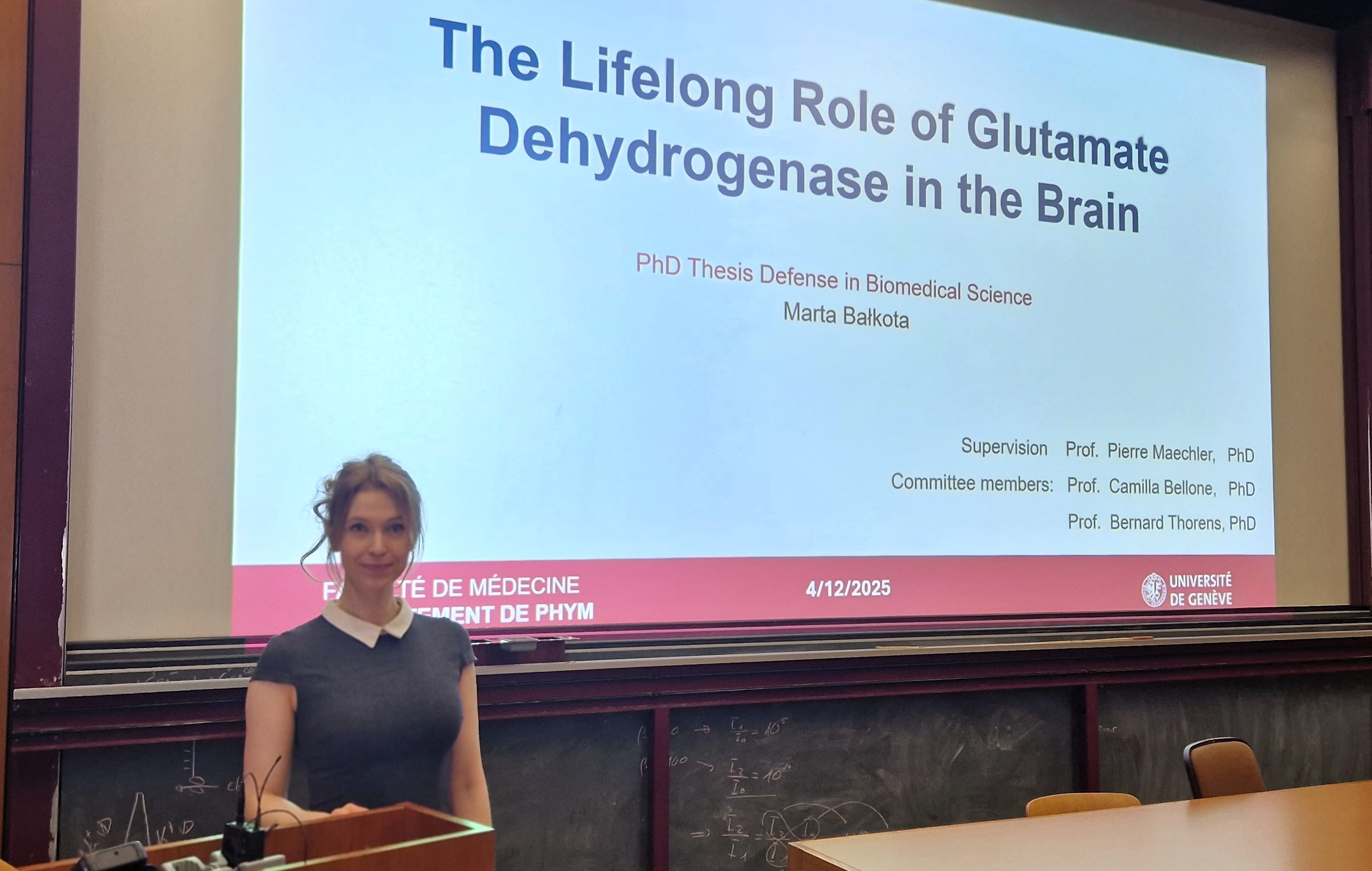 On the 4th of December 2025, Mrs Marta BALKOTA successfully defended her PhD thesis entitled "The lifelong role of glutamate dehydrogenase in the brain". Her thesis was conducted under the direction of Prof. Pierre MAECHLER from the Department of Cell Physiology and Metabolism.