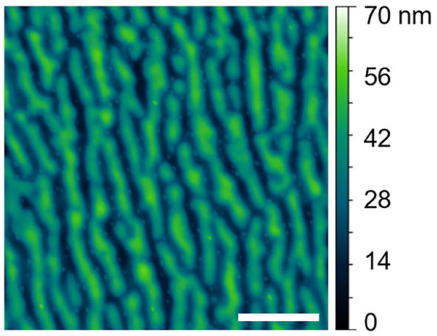 Microscopy image (on the left) of the nanocoatings covering the abdomen of the firefly Luciola lusitanica (adapted from Figure 1 in Kryuchkov et al. 2026 EMBO Reports) and simulation of nanocoating formation (on the right). The lighter the color, the taller the protuberances.