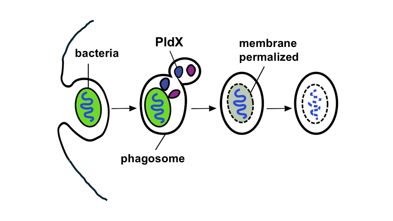 Once the bacteria is inside a phagosome, PldX attacks the bacterial membrane and permeabilizes it. © Adapted from the graphical abstract in Lamrabet et al. 2025, Mol. Microbiol.