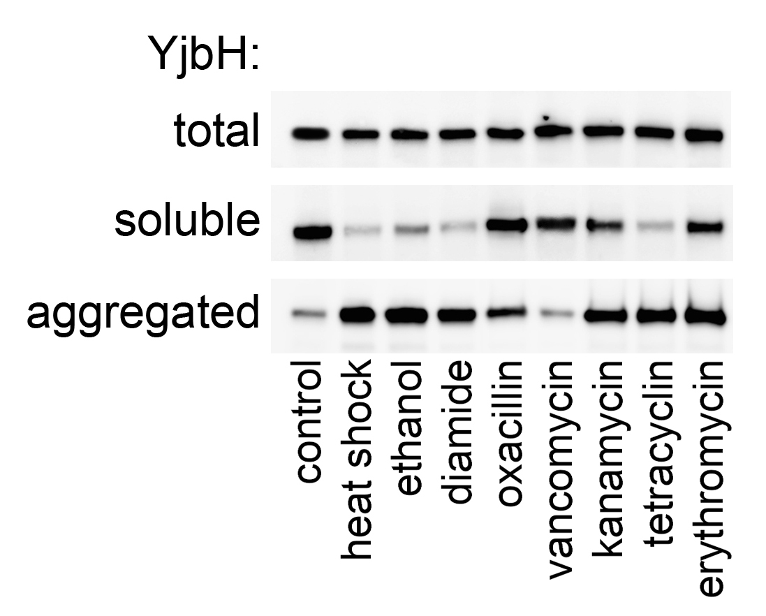 Fig. 2. YjbH is an adaptor protein required for targeted degradation in S. aureus. YjbH is aggregated upon heat shock, oxidative stress and antibiotics (1)