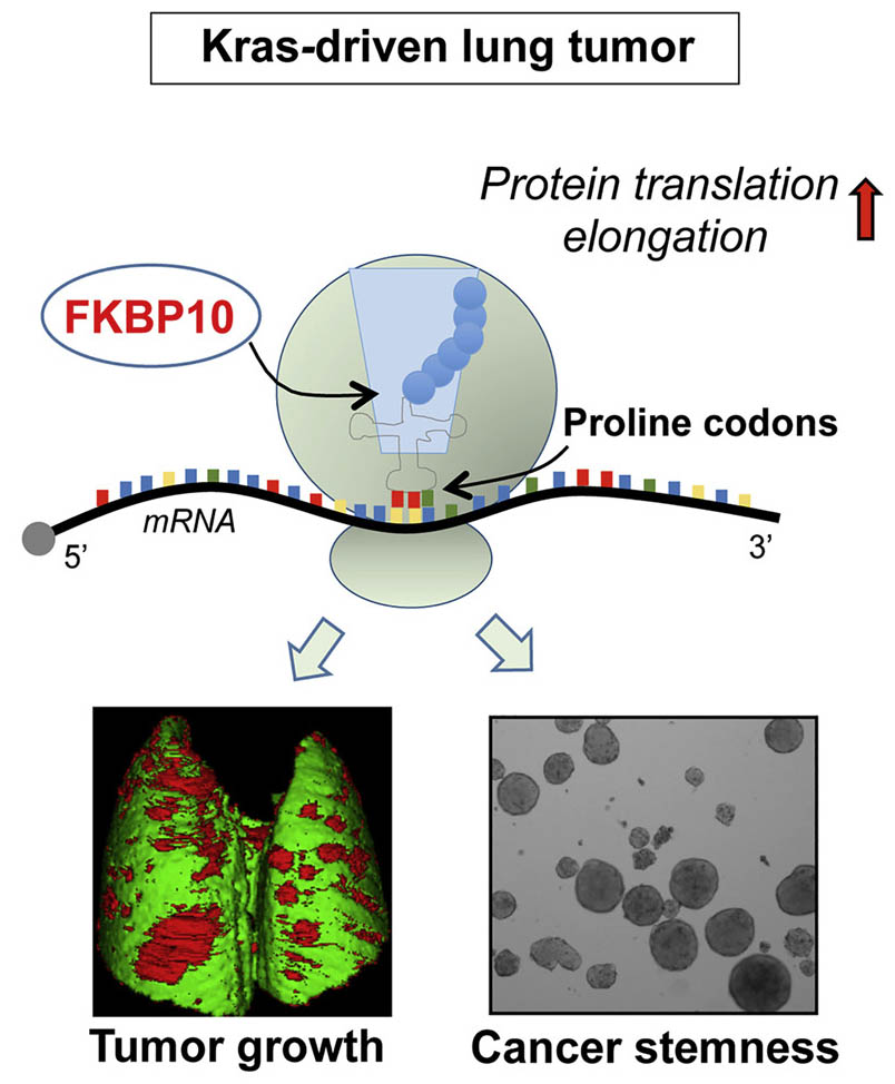 Using polysome fractionation and Ribo-Seq we demonstrated that peptidyl-prolyl-cis-trans-isomerase (PPIase) FK506-binding protein 10 (FKBP10) interacts with ribosomes, and its downregulation leads to reduction of translation elongation at the beginning of open reading frames (ORFs), particularly upon insertion of proline residues. Our data unveil FKBP10 as a cancer-selective molecule with a key role in translational reprogramming, stem-like traits, and growth of lung cancer.