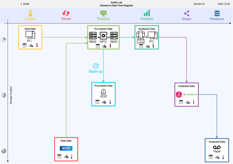 De plus, la Faculté de médecine propose un nouvel outil pour aider les chercheurs et chercheuses ainsi que les responsables de plateformes facultaires à mener une réflexion sur la vie des données au sein de leurs laboratoires : le Digramme de Flux des Données de Recherche (RDFD).