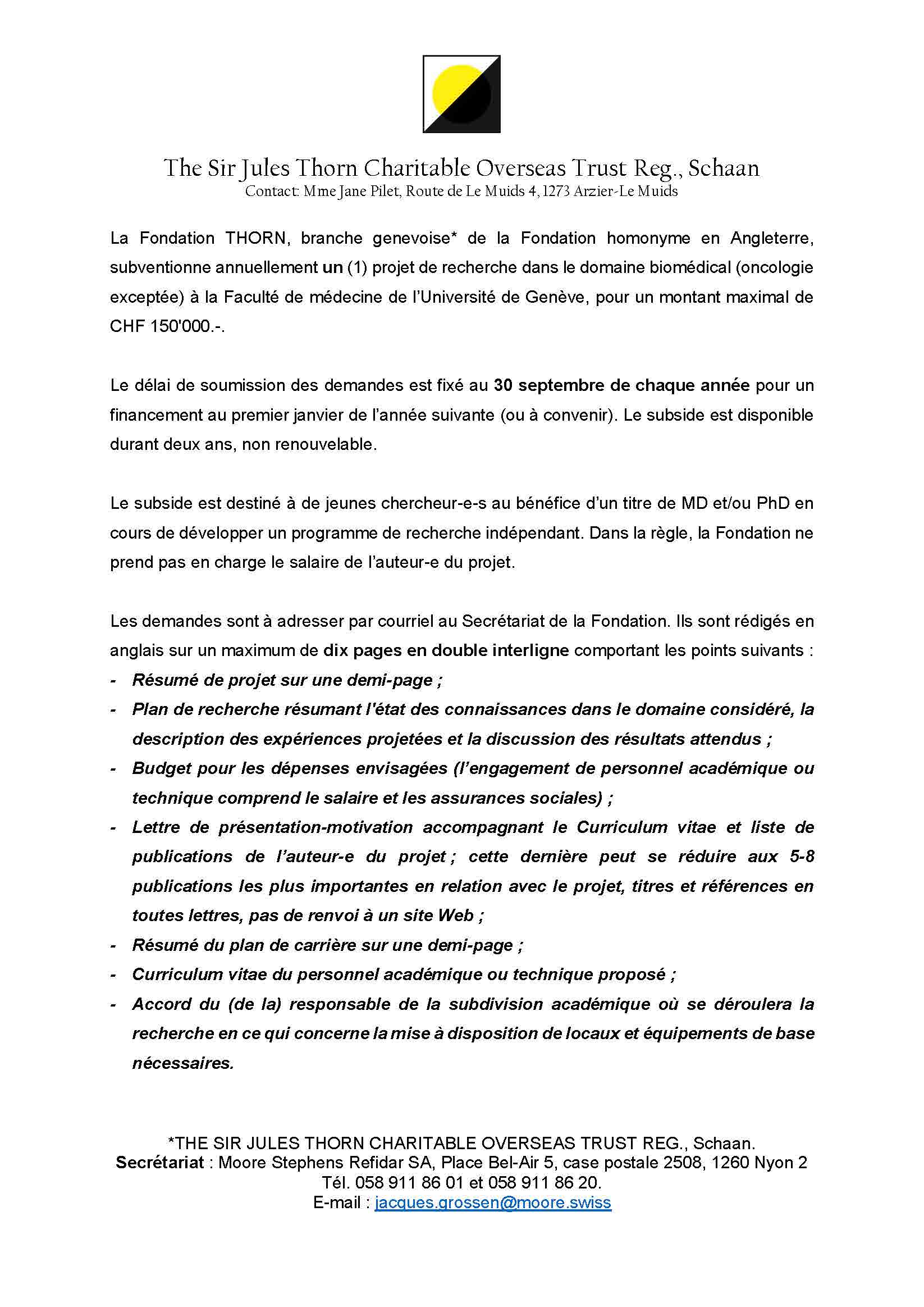 La Fondation THORN, branche genevoise de la Fondation homonyme en Angleterre, subventionne annuellement un (1) projet de recherche dans le domaine biomédical (oncologie exceptée) à la Faculté de médecine de I'Université de Genève, pour un montant maximal de CHF 150'000.-.