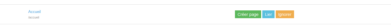 Le rapport indique les pages qui n'ont pas de page associée dans l'autre langue, et fournit des raccourcis pour créer une page associée, lier la page à une page existante dans l'autre locale, ou ignorer l'absence d'association. Les associations existantes peuvent également être remappées ou désassociées à partir de cette interface.