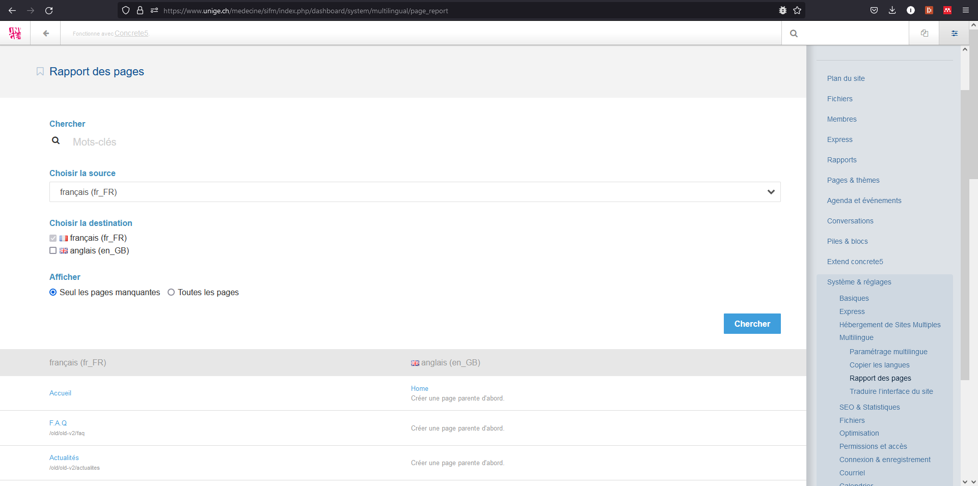 Le rapport des pages dans Concrete CMS est un outil qui vous permet de visualiser et de gérer les pages traduites pour chaque langue de votre site multilingue et vous indique quelles pages sont associées entre les langues.