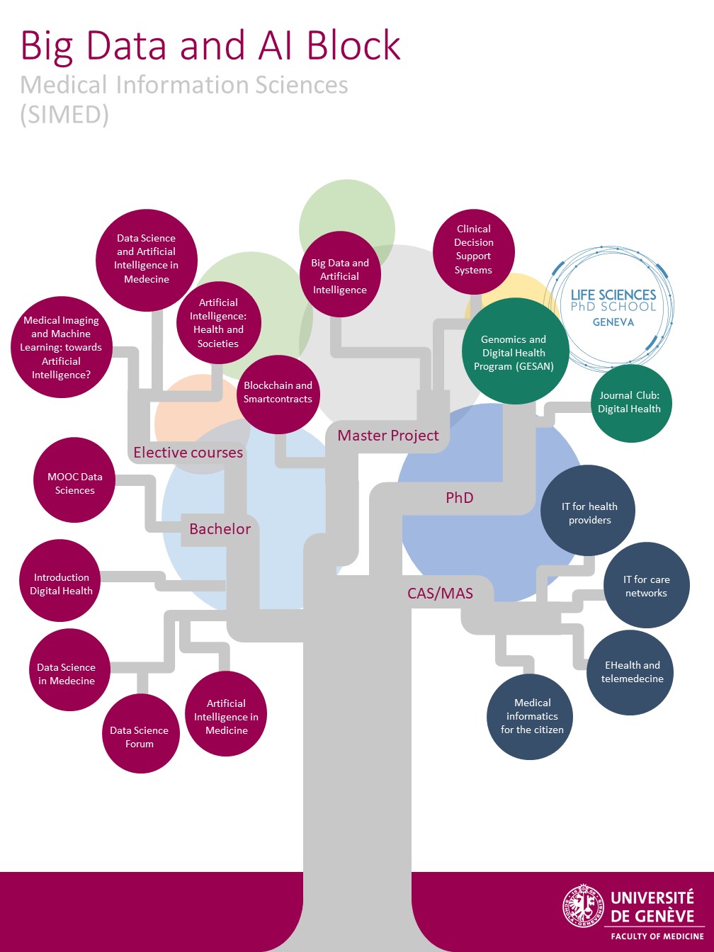 This teaching makes it possible to build a coherent offer at the Faculty of Medicine of Geneva in the field of digital health and more specifically in data sciences from the 2nd year Bachelor of Medicine. This first phase can be deepened and completed in 3rd year Bachelor with optional courses, and Master years with master work specific to the field. Finally, it will facilitate the possibility of continuing training in various doctoral schools, and especially in the doctoral school in life sciences, "Genomics and digital health".