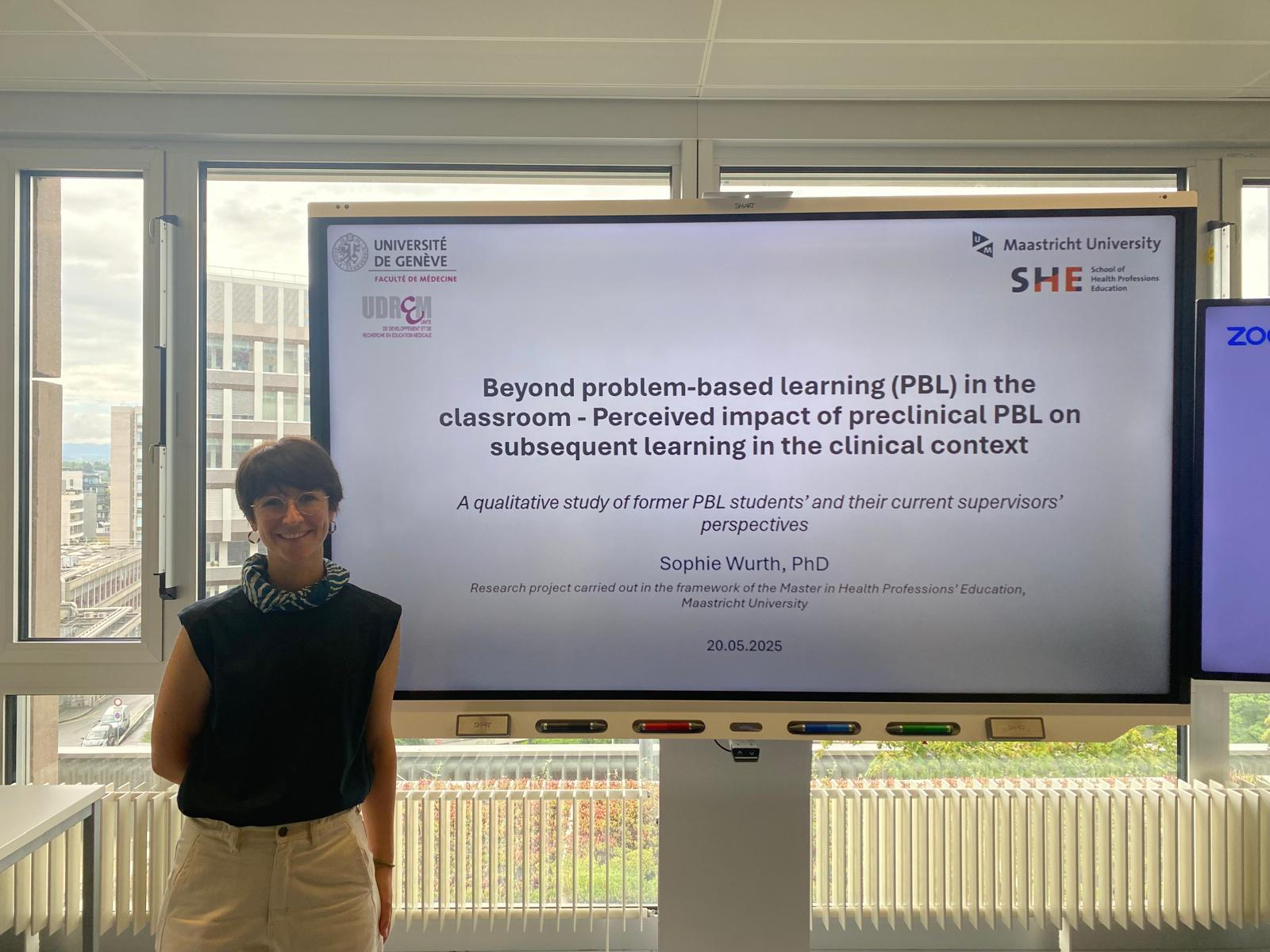 Dans le cadre de l'obtention du Master in Health Professions' Education de l'Université de Maastricht, la Dre Sophie Wurth a présenté mardi 20 mai dernier son projet de recherche qui porte sur l'impact perçu du format d'apprentissage APP dans l'enseignement préclinique sur l'apprentissage en milieu clinique par les étudiant-es de master et leurs superviseurs cliniques.