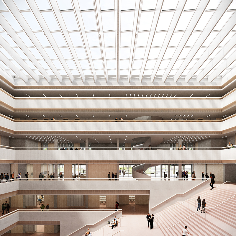 Outre des auditoires et des salles de cours, le bâtiment proposera des lieux dédiés au travail et à l’échange: vaste salle de lecture, box de travail, salles de réunion pour les associations étudiantes, cafétéria et salles multi-usages. © FHV