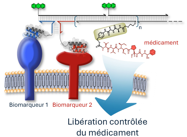 Médicaments intelligent à base d’ADN. Médicaments intelligents à base d’ADN. Quand les deux « détecteurs » reconnaissent simultanément les biomarqueurs 1 (bleu) et 2 (rouge) à la surface d’une cellule malade, les fragments d’ADN s’assemblent comme un puzzle et déclenchent une réaction en chaîne qui libère le médicament au cœur de cette cellule, tout en préservant au maximum les cellules saines voisines. (Adaptation de la figure 1 de l’article original (Chen, SK., López-Tena, M., Russo, F. et al. DNA–drug conjugates enable logic-gated drug delivery amplified by hybridization chain reactions. Nat Biotechnol, 2026).