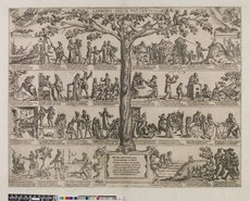 This etching describes in thirty scenes the dangerous aspects of human interactions, professions or activities. It has a satirical & moralizing purpose. The scene ends with the stoning of the fool.