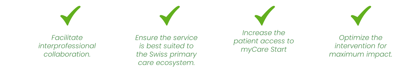 - WP1 Stakeholder engagement: to engage key stakeholders within the Swiss primary care ecosystem to contribute to the creation of a Swiss interprofessional myCare Start service.