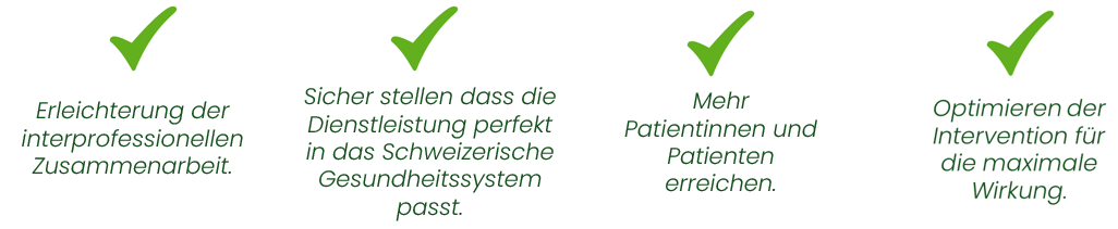 - WP1 Einbindung der Interessengruppen: Beteiligung der wichtigsten Akteure der Grundversorgung in der Schweiz, um gemeinsam eine interprofessionelle myCare Start-Dienstleistung zu entwickeln, die auf den nationalen Kontext zugeschnitten ist.